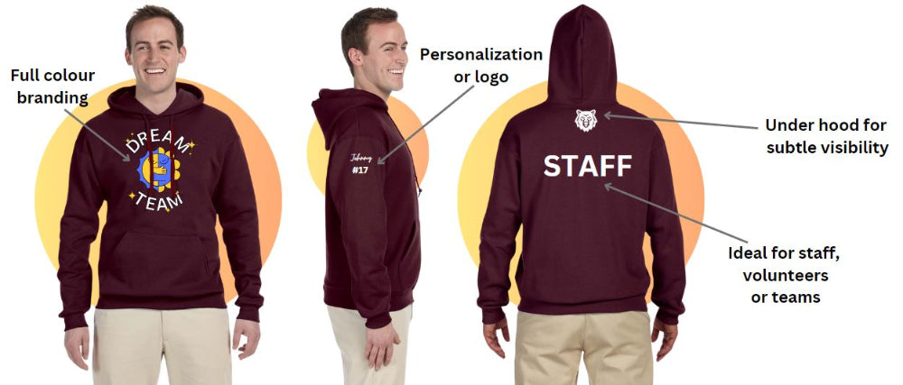 Our team has decorated literally thousands of hoodies for events, sports team, trade shows and more. We will get your order exactly how you want it!